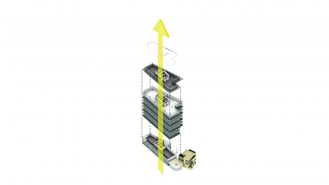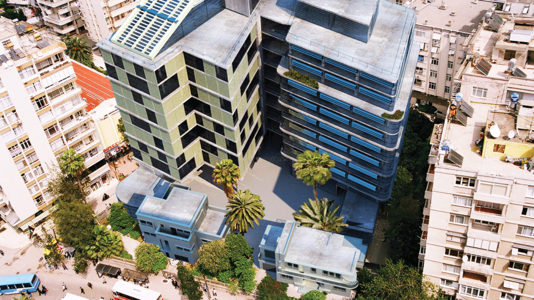 It is business centre complex project which aims to restore the two houses built by architect Semih Rüstem at the beginning of the 1930s, to build a new complex on the plot surrounding them and to integrate to the existing. The two-new reinforced concrete and glass blocks constitute a visual background to the smaller structures. Transparent surfaces are protected by either sliding vertical panels or horizontal land metallic sun shading elements. A shaded courtyard takes place between these four blocks. Small glass pavillions, wintergarden café are located in the courtyard and realize a relation in scale between the new higher and smaller old buildings.